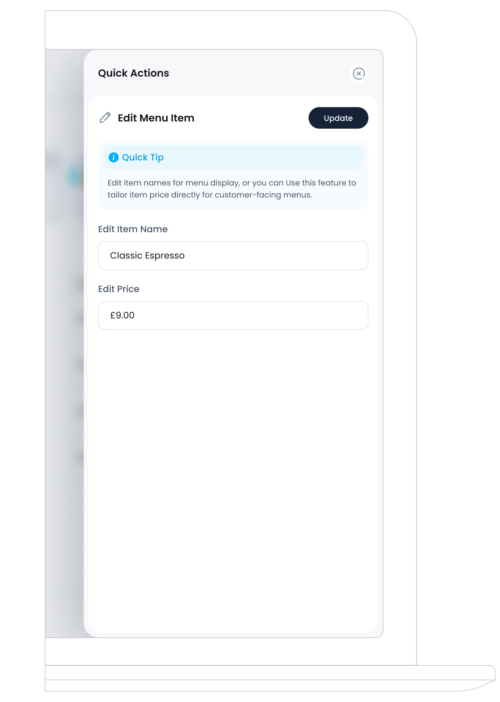 Editing an item in Menu Management allows you to change its name and price as they appear in customer-facing views, (such as the POS, kiosk, or online ordering channels). Also, you can adjust the price specifically for this menu. These changes apply only to this menu and do not affect the main inventory item settings.