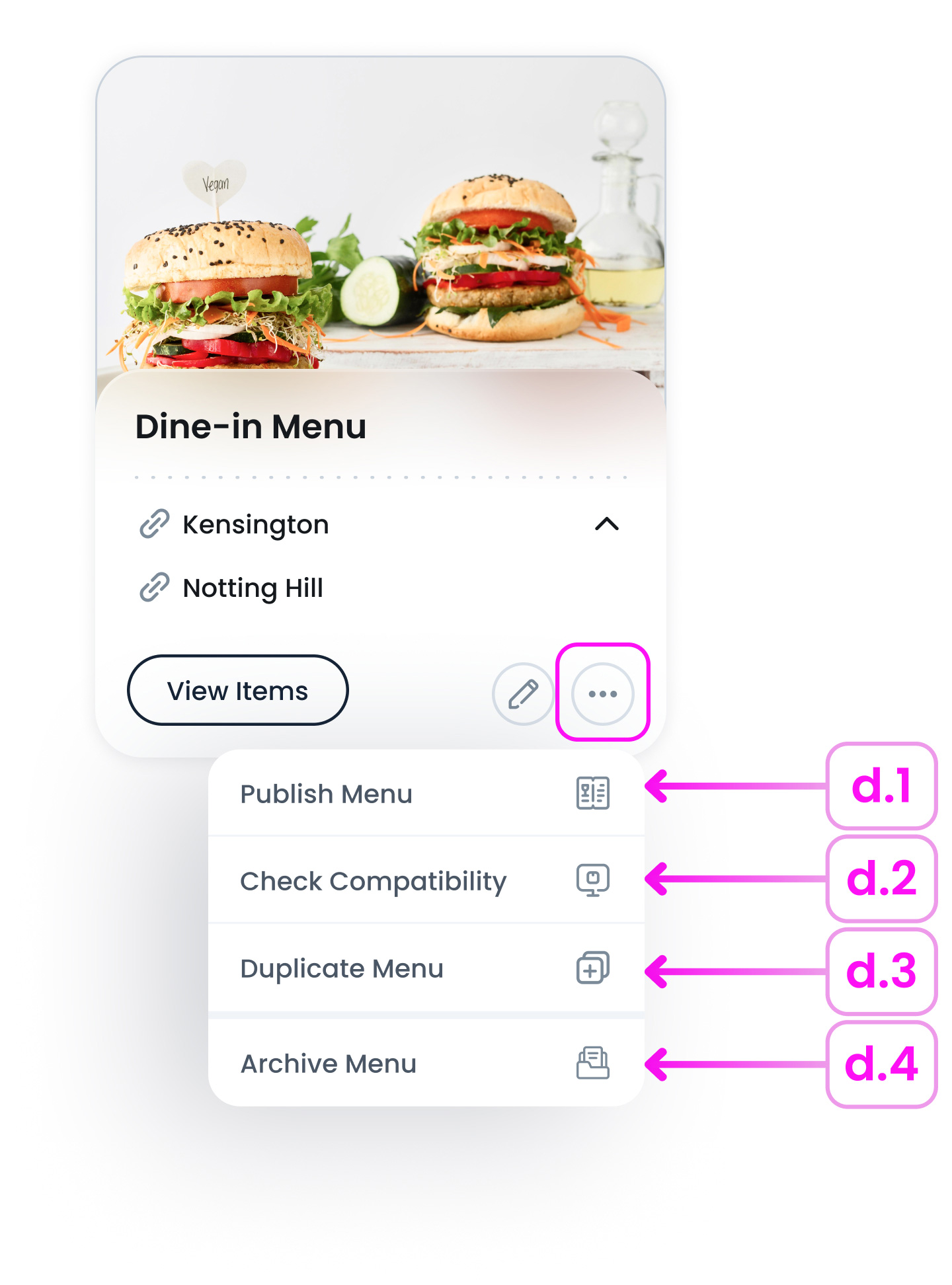 - d.3. Duplicate Menu If you want to quickly create a new menu based on an existing one, you can duplicate it and then edit only the parts you need. For detailed steps, see Duplicate an Existing Menu.